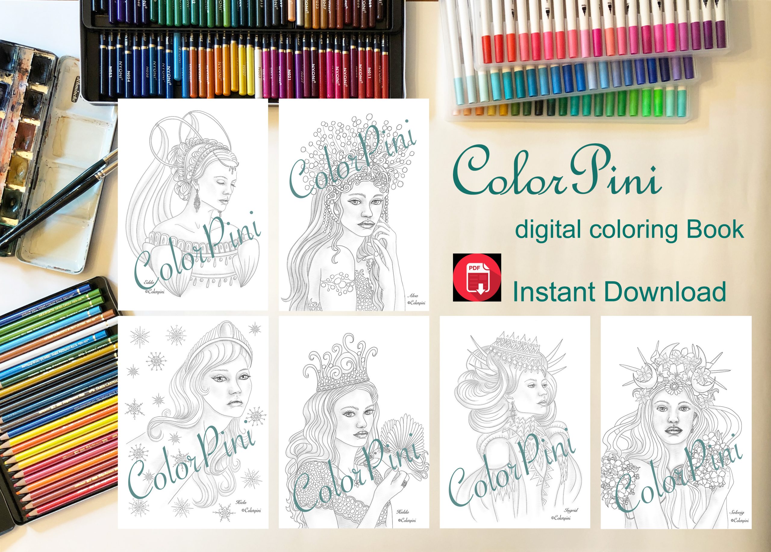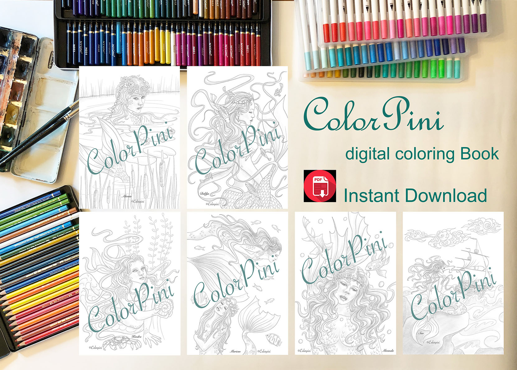 MERMAIDS VOLUME 2 – digital Coloring Pages for Adults – 6 gorgeous designs in a LINEART and a GRAYSCALE LIGHT PDF – just download and print from Etsy Colorpini