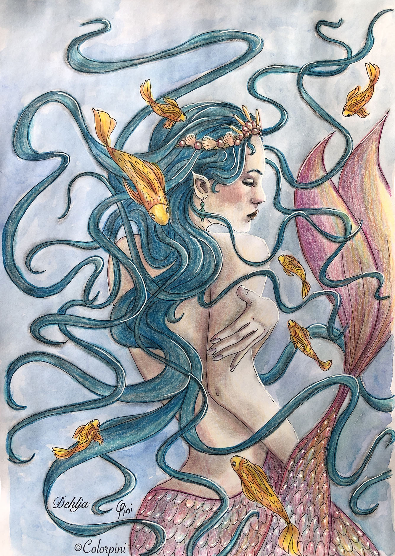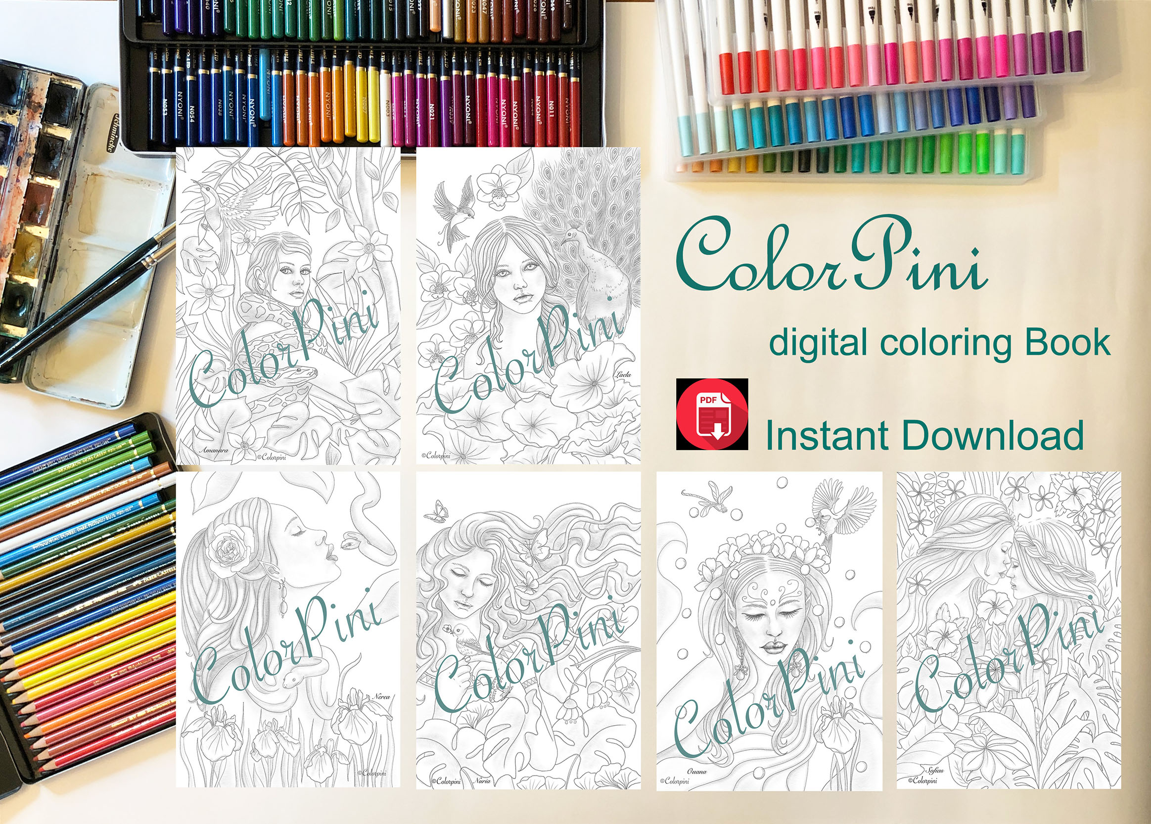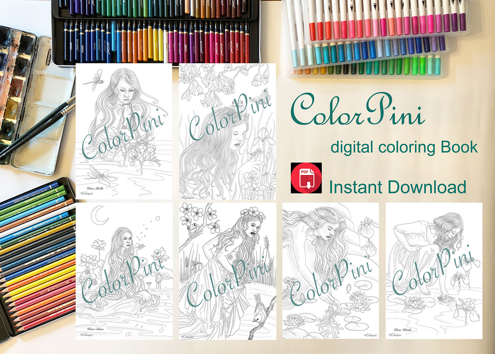 WATER NYMPHES – digital Coloring Pages for Adults – 6 gorgeous designs in a LINEART and a GRAYSCALE LIGHT PDF – just download and print from Etsy Colorpini