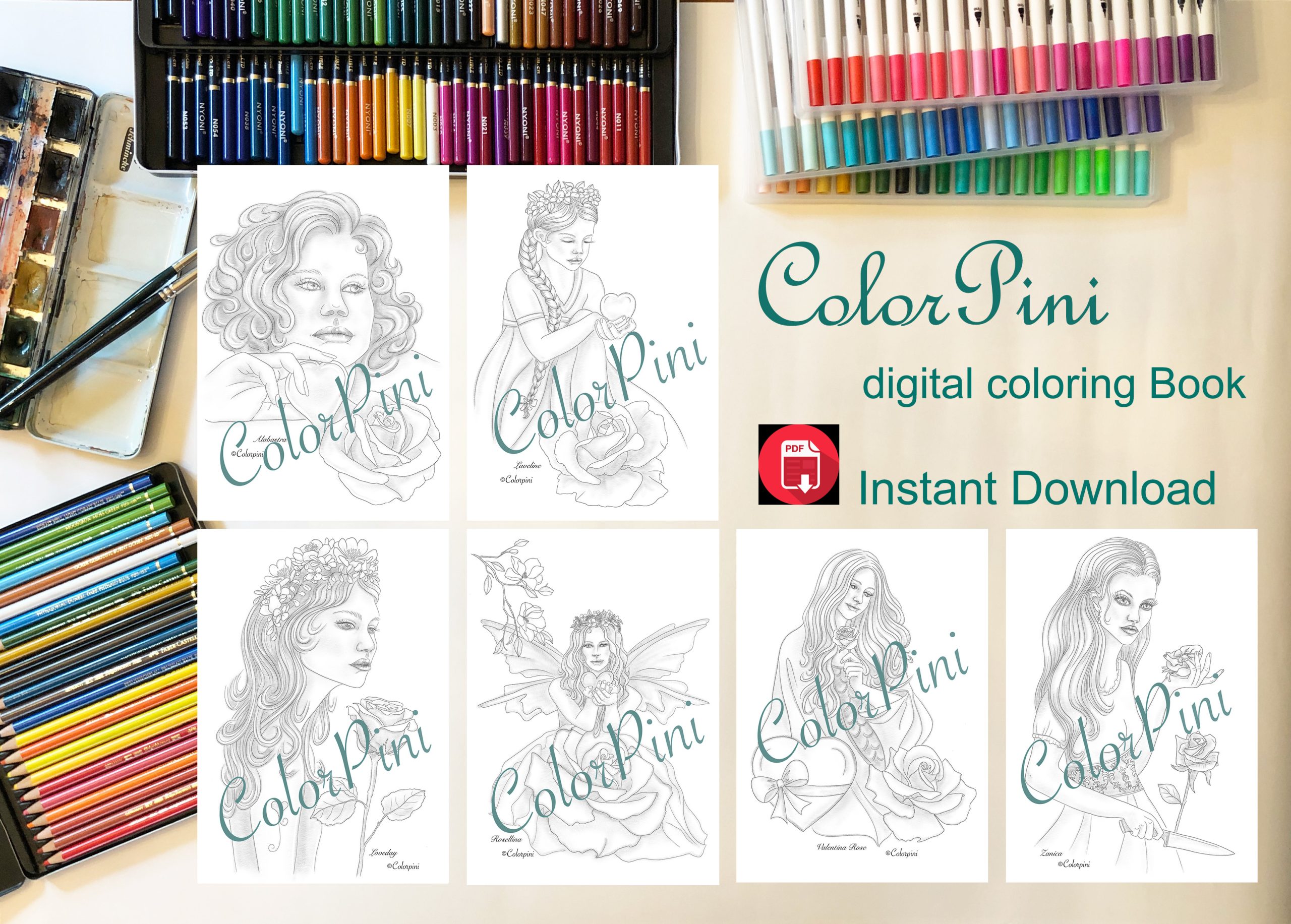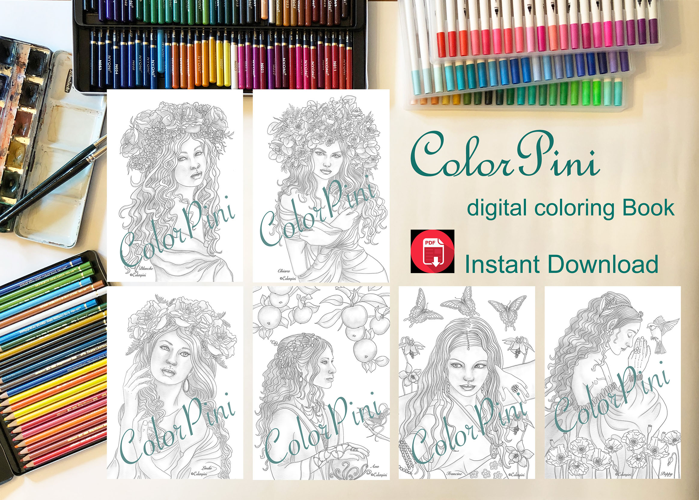 FLOWER PRINCESS FAIRIES – digital Coloring Pages for Adults – 6 gorgeous designs in a LINEART and a GRAYSCALE LIGHT PDF – just download and print from Etsy Colorpini
