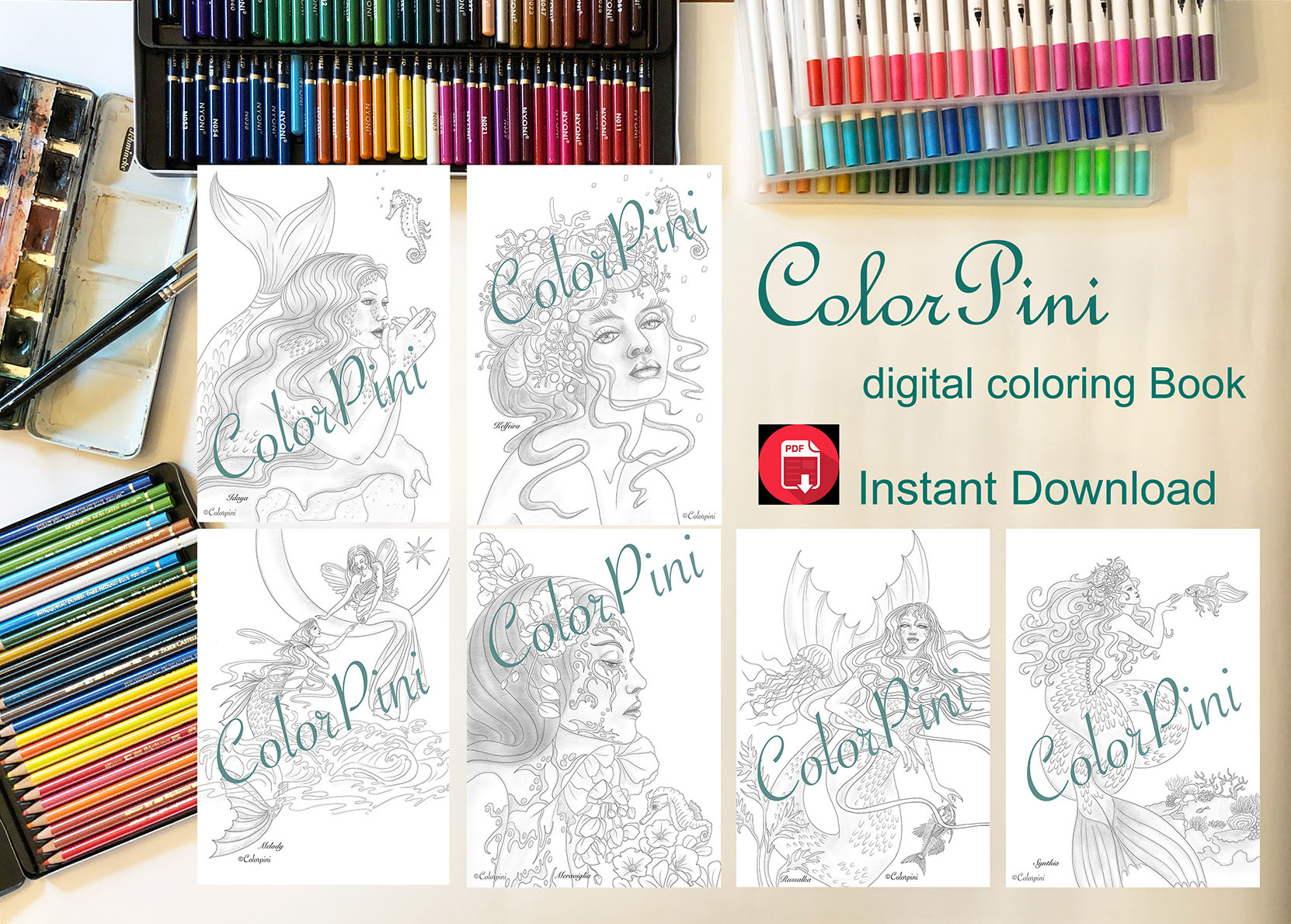 MERMAIDS VOLUME 1 – digital Coloring Pages for Adults – 6 gorgeous designs in a LINEART and a GRAYSCALE LIGHT PDF – just download and print from Etsy Colorpini