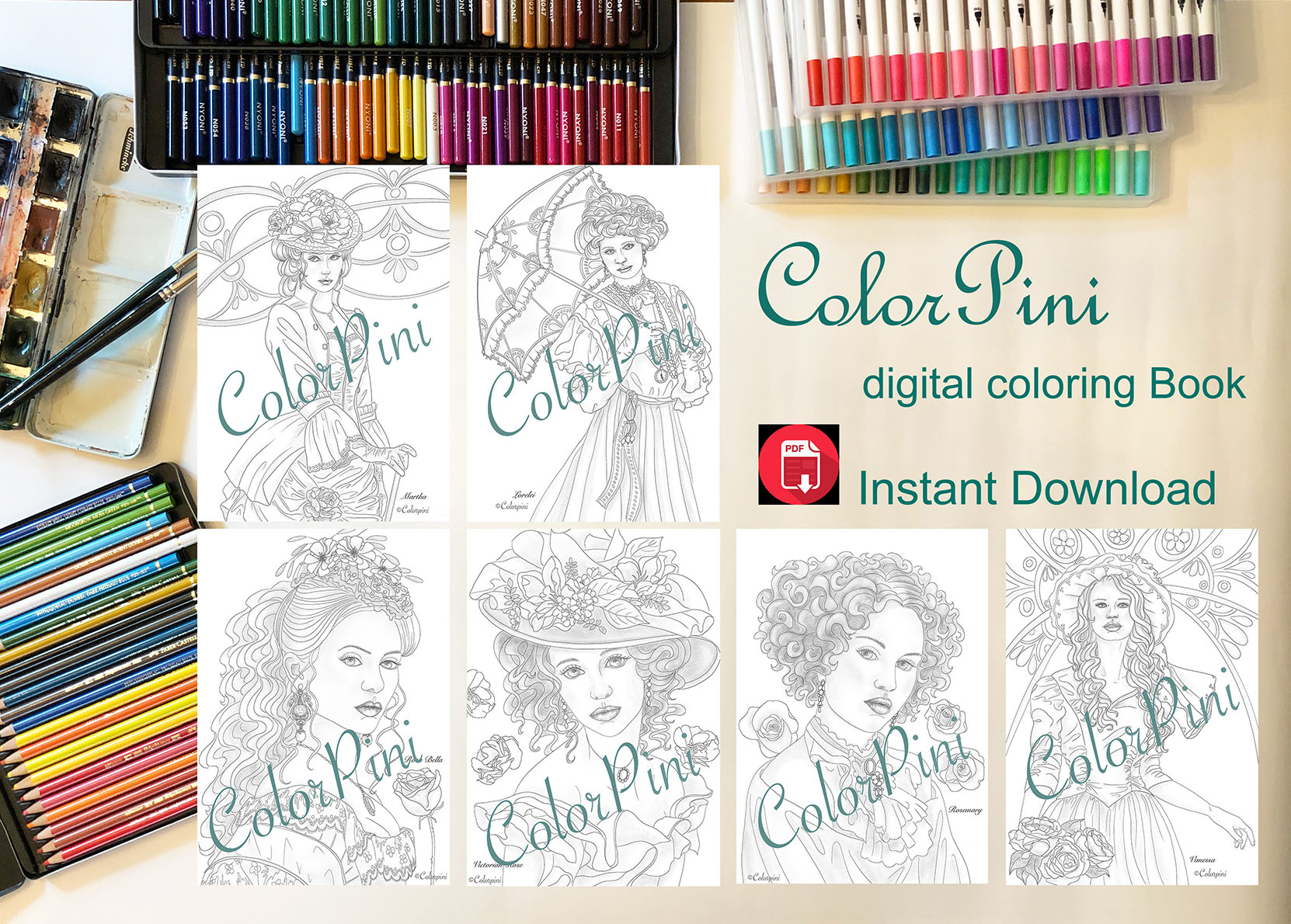 VICTORIAN BEAUTIES 1 – digital Coloring Pages for Adults – 6 gorgeous designs in a LINEART and a GRAYSCALE LIGHT PDF – just download and print from Etsy Colorpini