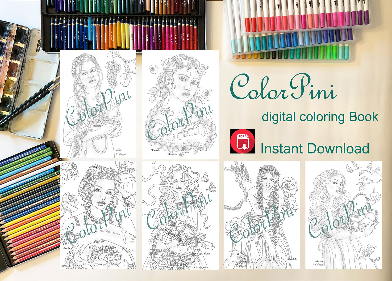 I love to explore a theme, so I draw 6 pages of a topic and you can get them in a bundle of 6 on Etsy Colorpini, you will get 1 pdf with all 6 in lineart an 1 pdf with all 6 in grayscale light for you to enjoy your full creativity.