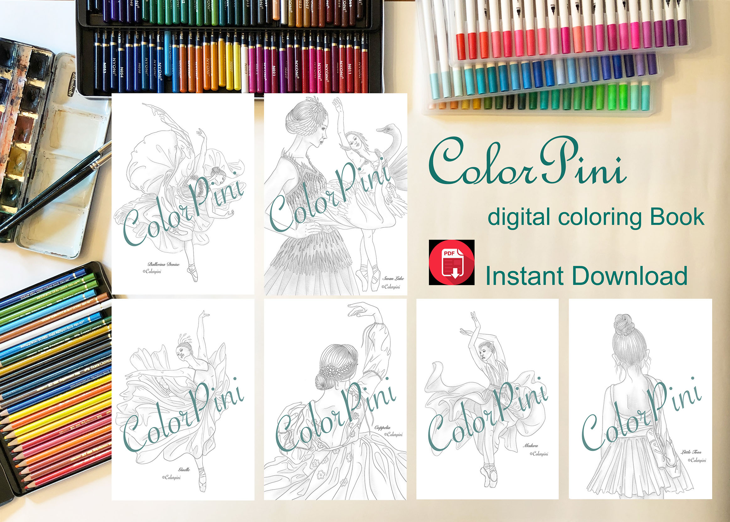 DANCERS BALLERINA Volume 1 – digital Coloring Pages for Adults – 6 gorgeous designs in a LINEART and a GRAYSCALE LIGHT PDF – just download and print from Etsy Colorpini
