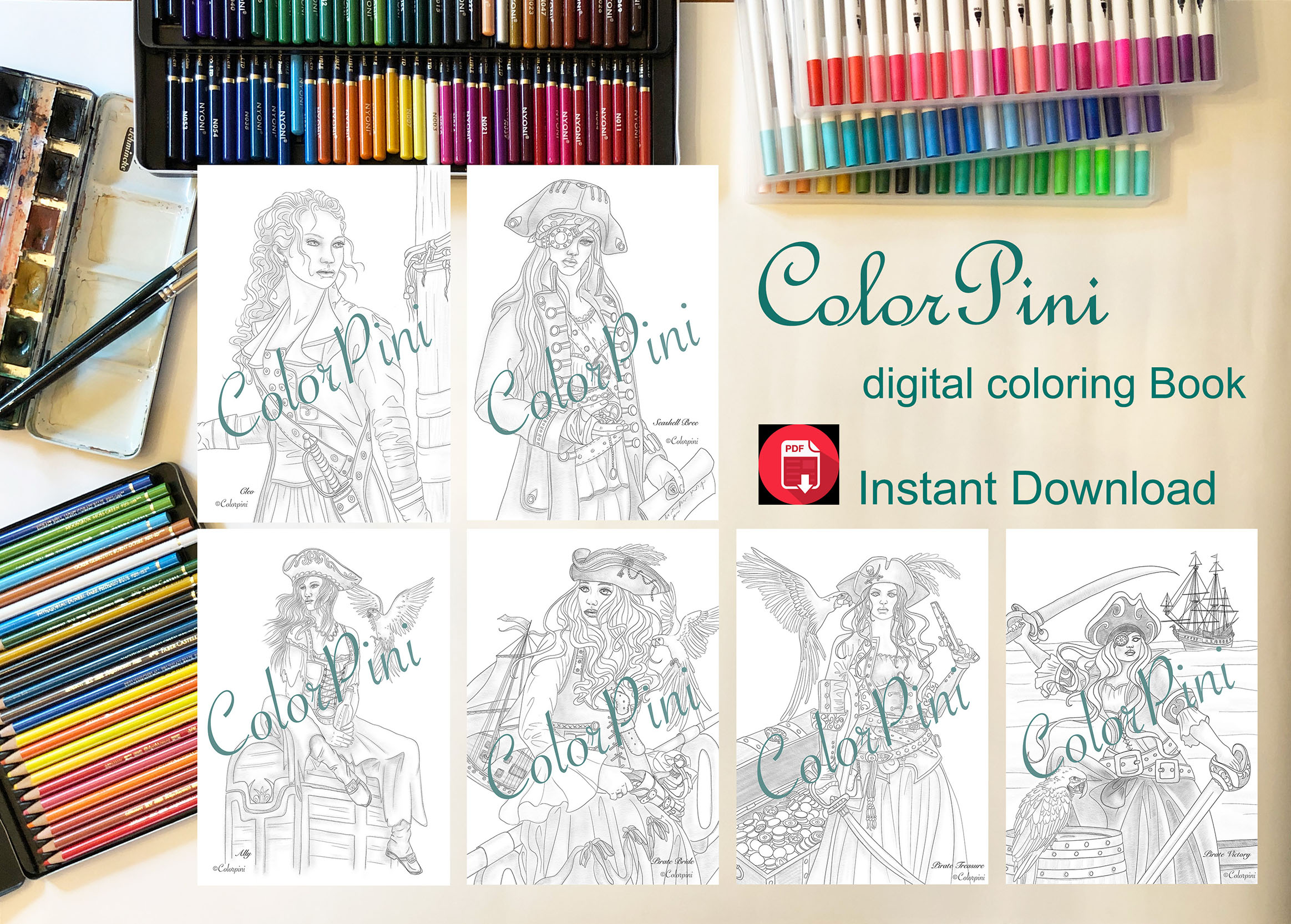 PIRATES VOLUME 1 – digital Coloring Pages for Adults – 6 gorgeous designs in a LINEART and a GRAYSCALE LIGHT PDF – just download and print from Etsy Colorpini