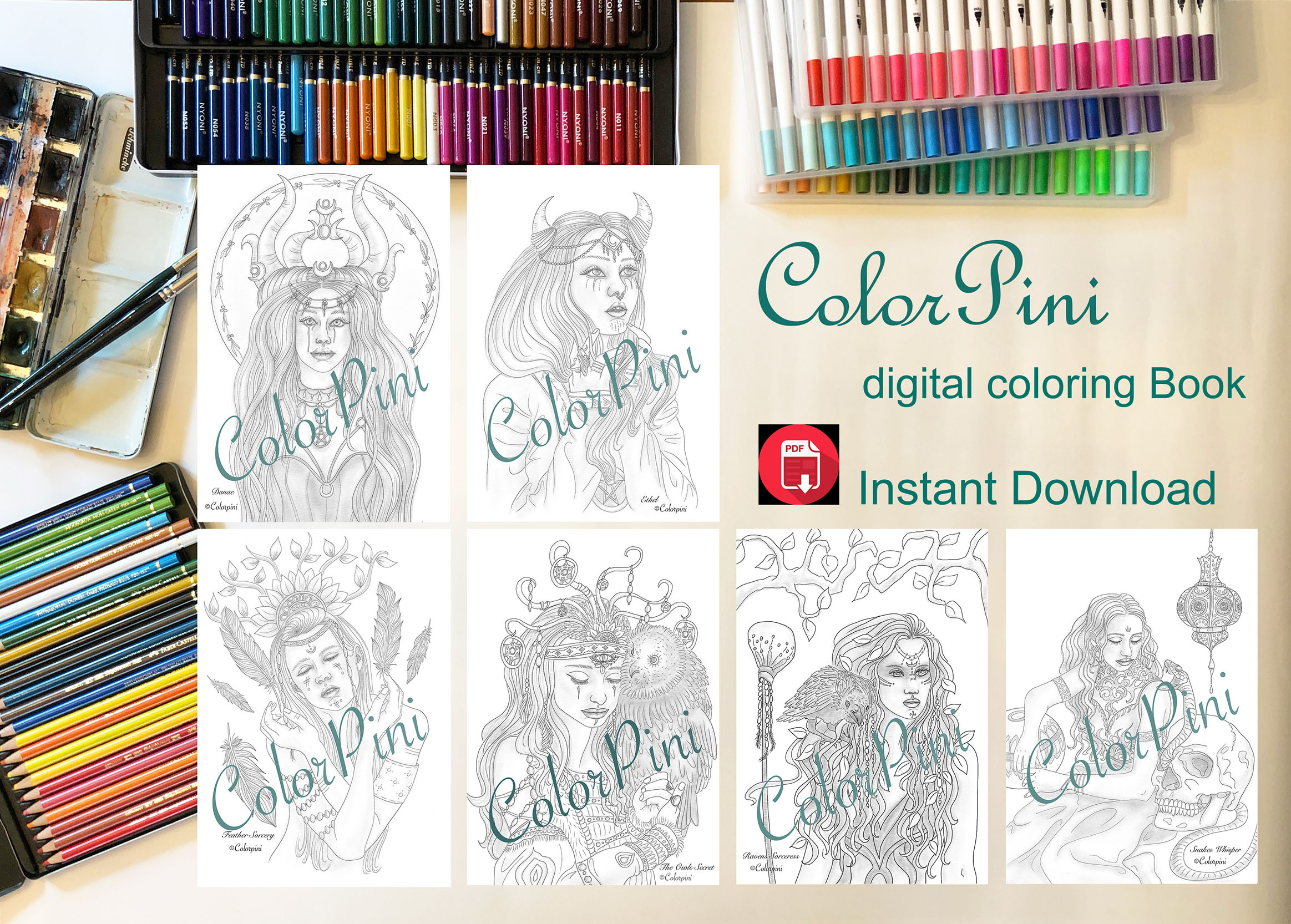 SORCERESS VOLUME 1 – digital Coloring Pages for Adults – 6 gorgeous designs in a LINEART and a GRAYSCALE LIGHT PDF – just download and print from Etsy Colorpini