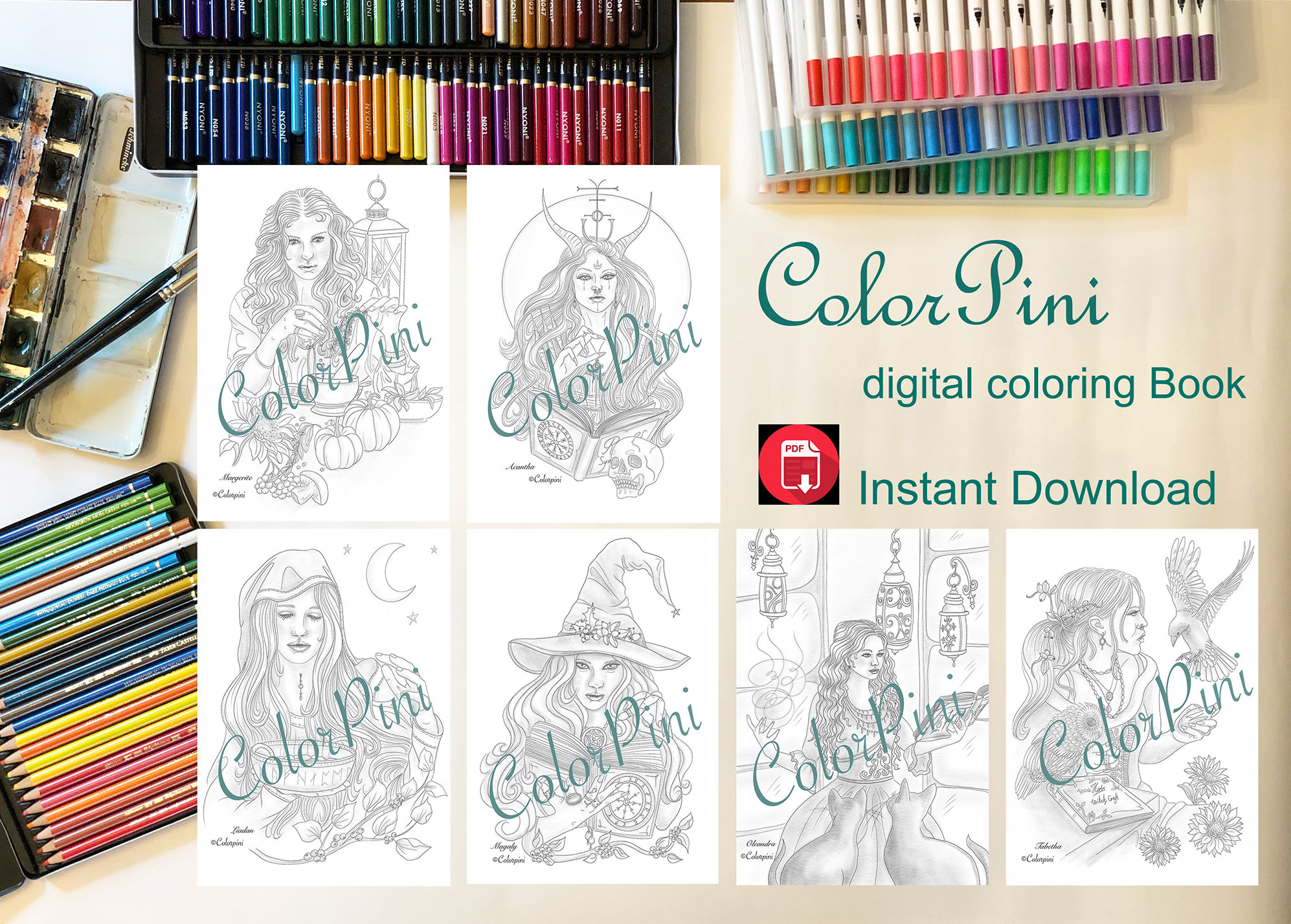 WITHCES VOLUME 2 – digital Coloring Pages for Adults – 6 gorgeous designs in a LINEART and a GRAYSCALE LIGHT PDF – just download and print from Etsy Colorpini