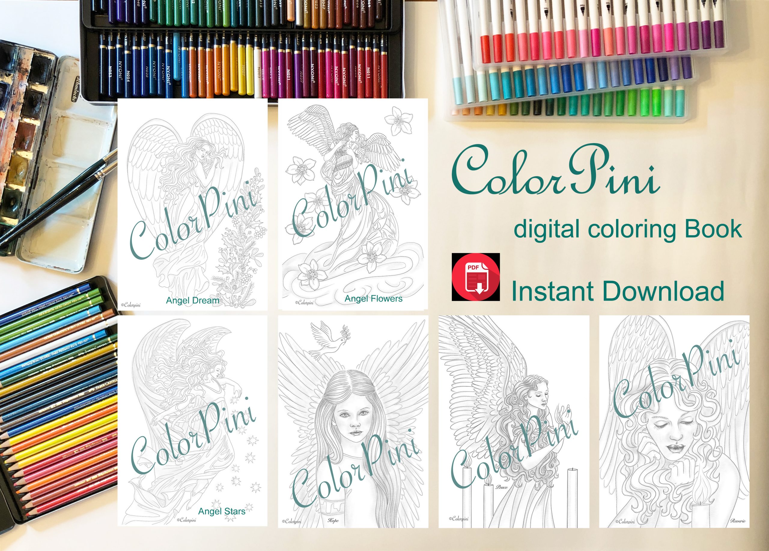 ANGELS VOLUME 1 – digital Coloring Pages for Adults – 6 gorgeous designs in a LINEART and a GRAYSCALE LIGHT PDF – just download and print from Etsy Colorpini